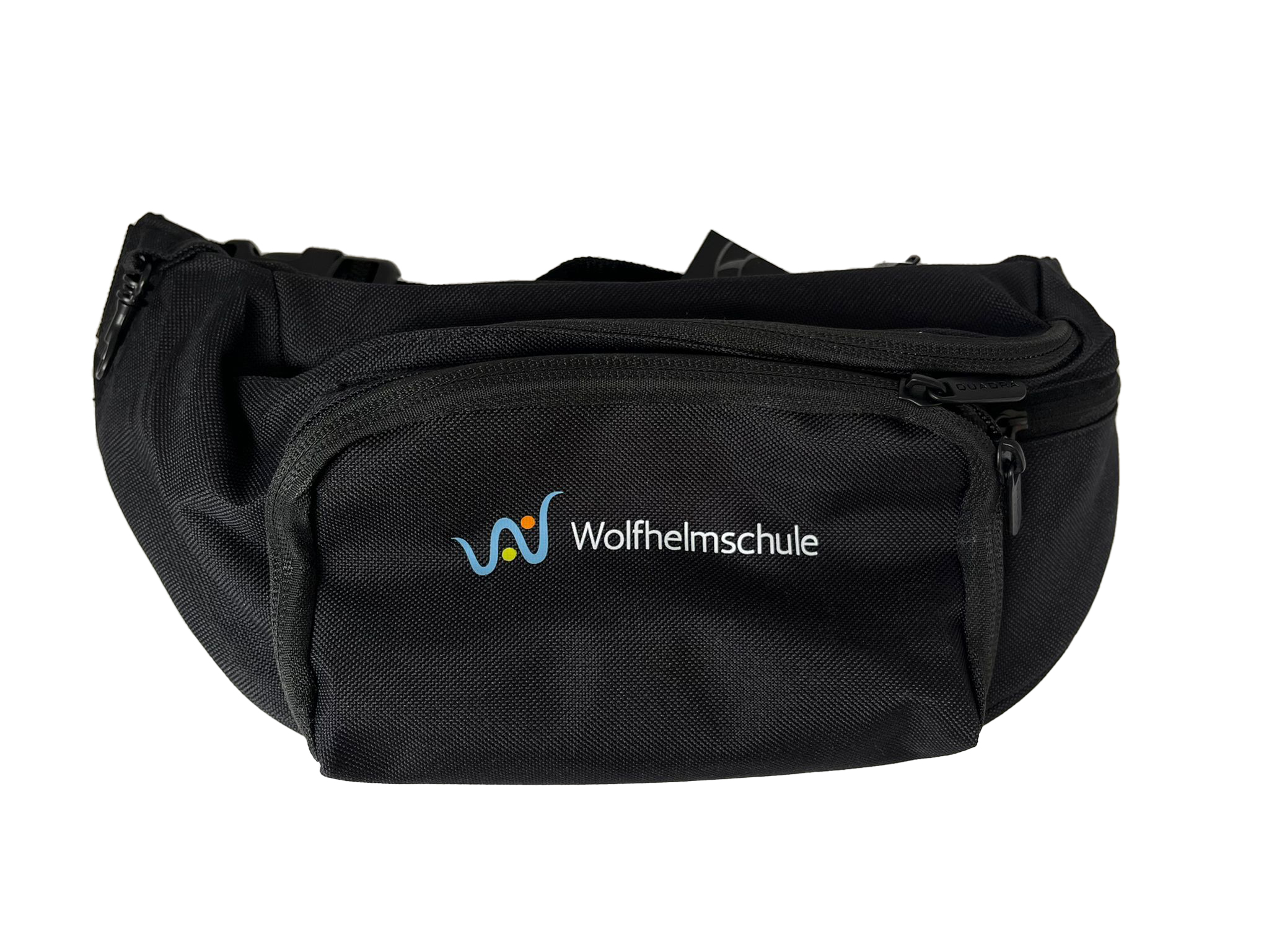 Schwarze Shoulder Bag mit Wolfhelmschulen-Logo.